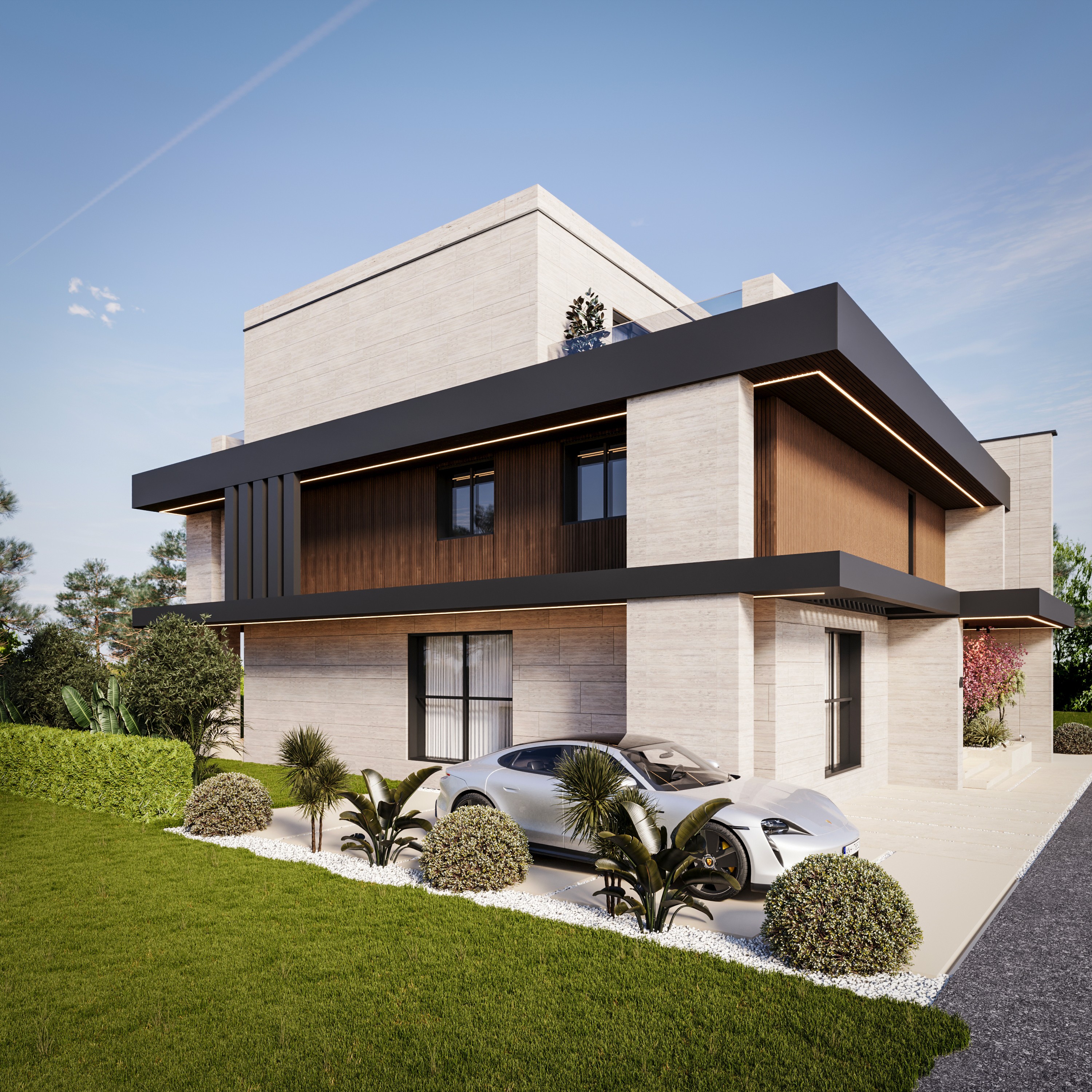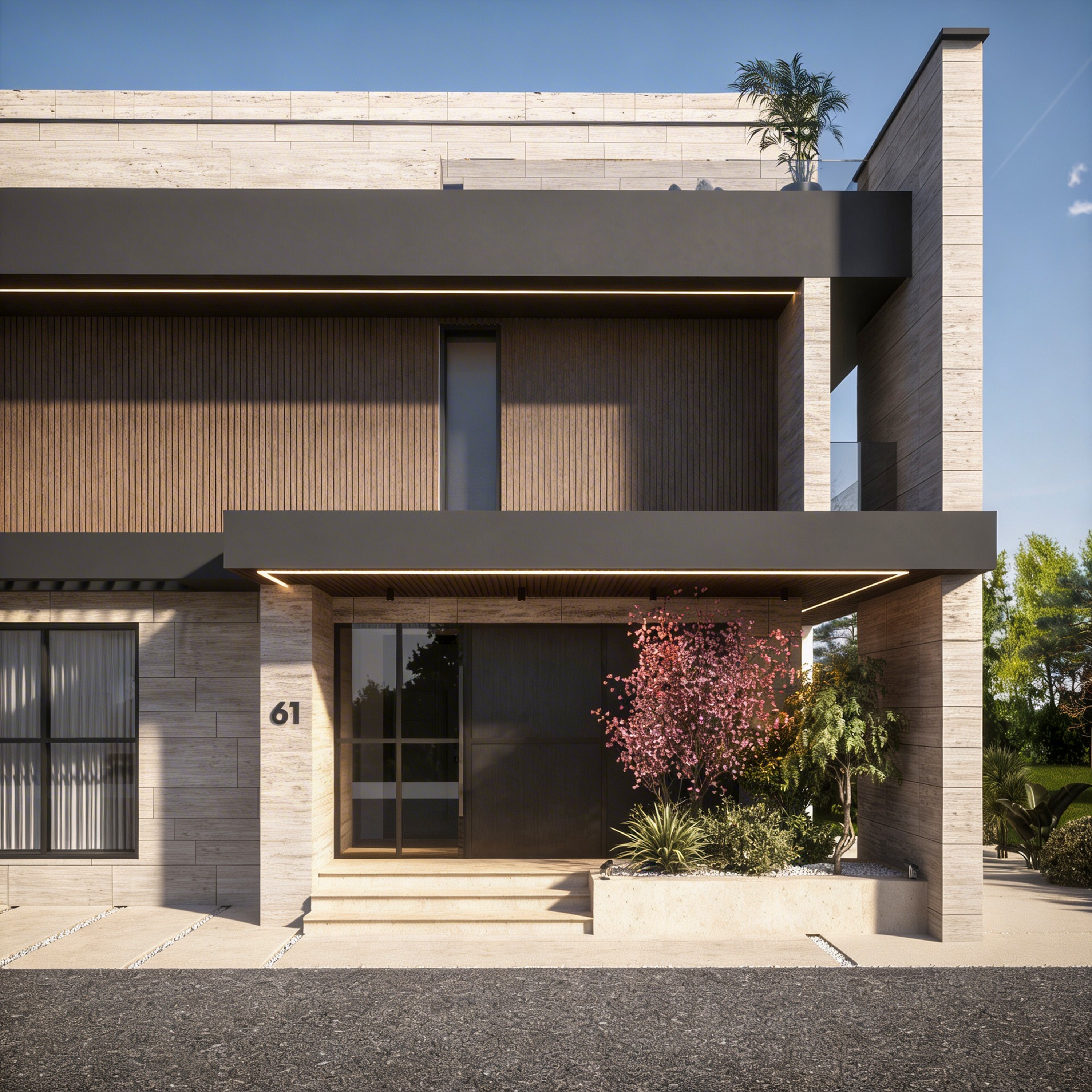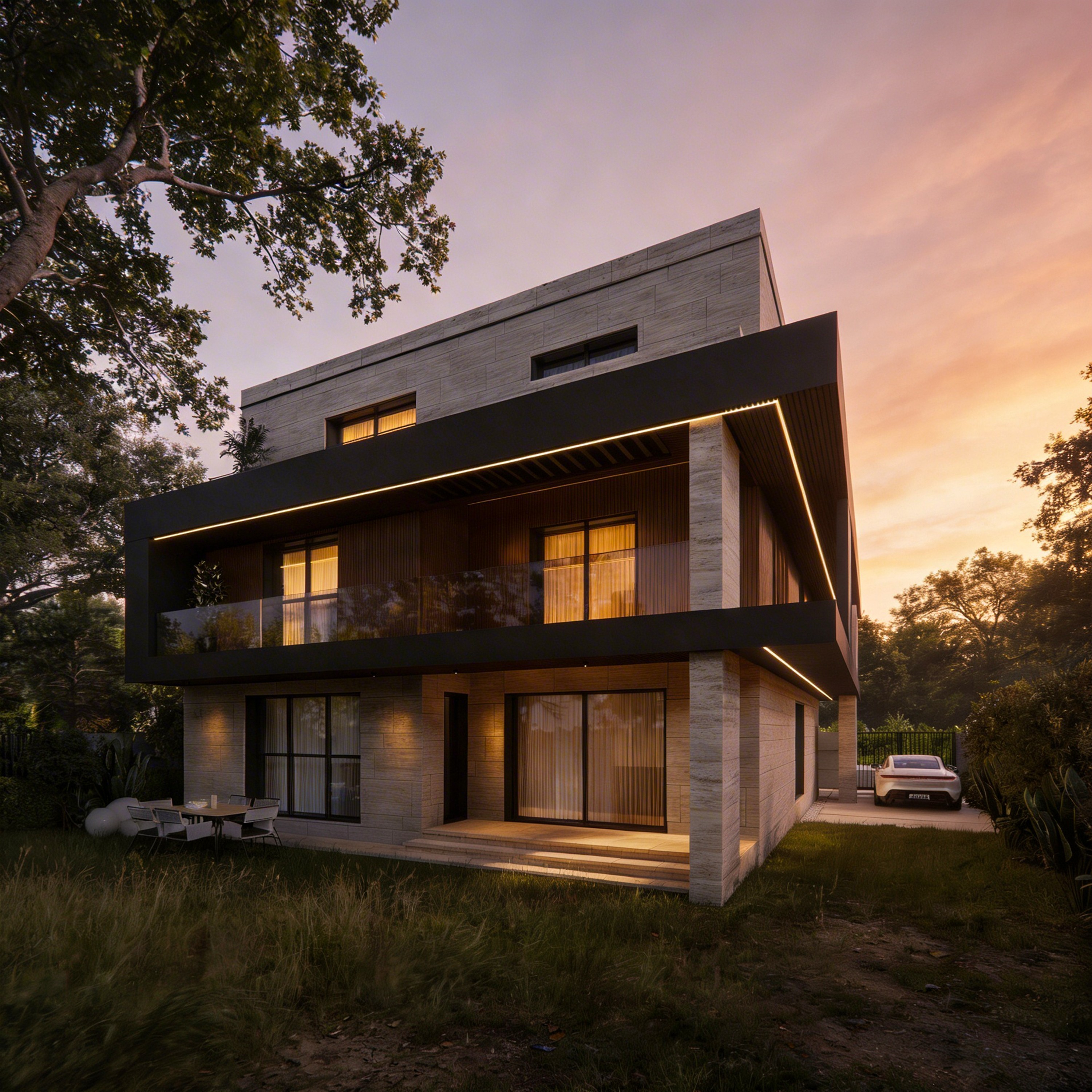 This contemporary villa is characterized by clean horizontal volumes and a refined minimalist design. The architecture combines natural stone, warm wood textures, and dark framing elements to create a balanced and elegant façade. Large glazed openings connect the interior spaces with the surrounding garden, while generous terraces and deep overhangs provide comfort, shade, and continuity between indoor and outdoor living. Integrated linear lighting enhances the architectural geometry at night, giving the villa a calm and sophisticated presence. The project expresses modern luxury through simplicity, proportion, and a strong relationship with nature, resulting in a timeless residential design.