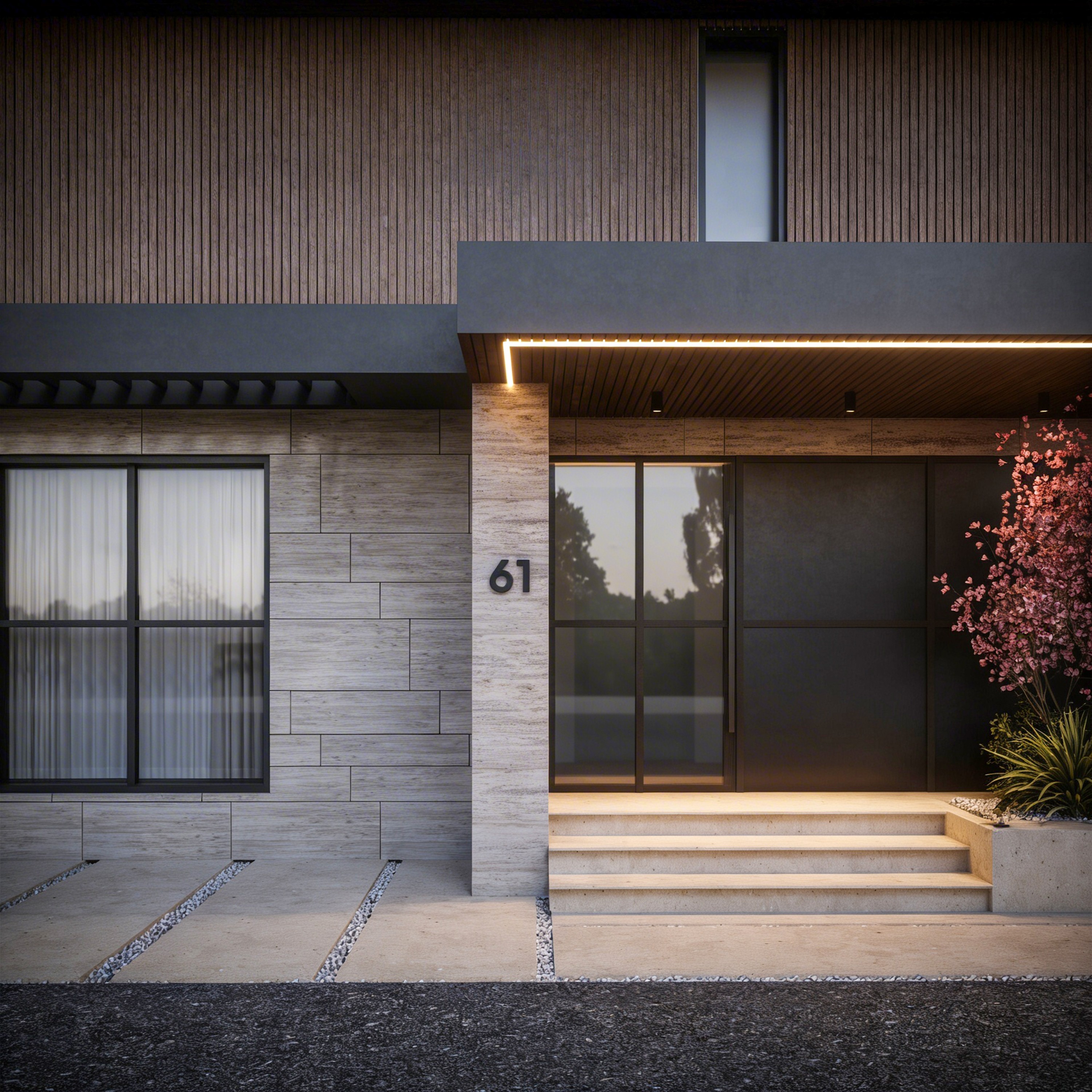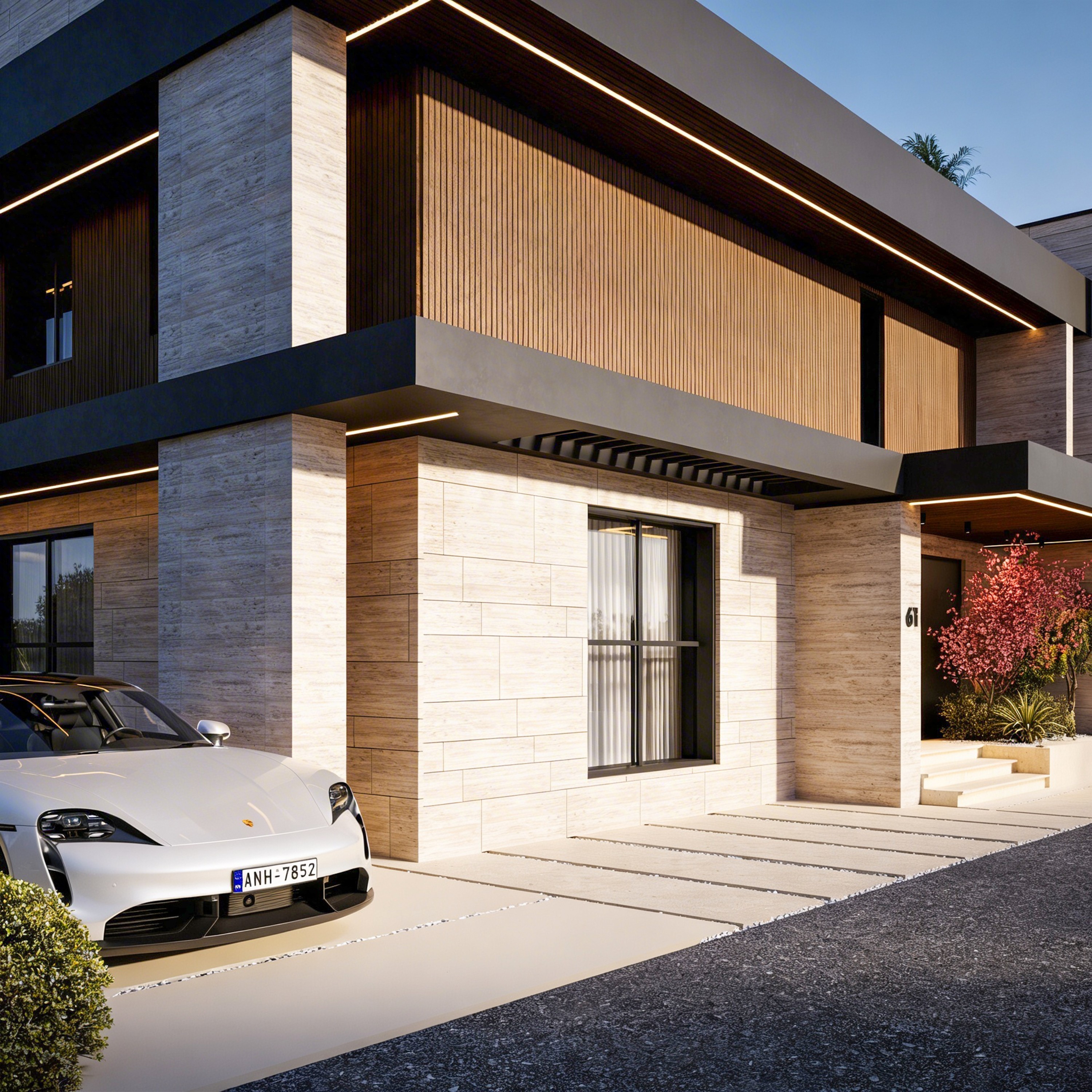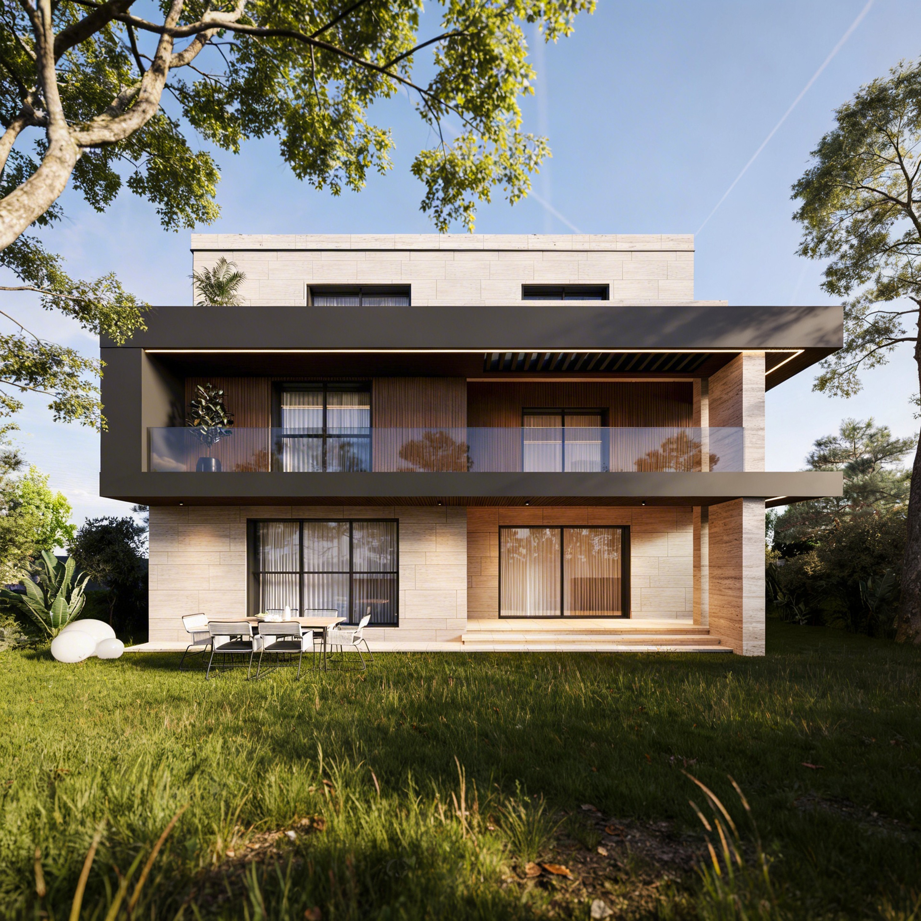 This contemporary villa is characterized by clean horizontal volumes and a refined minimalist design. The architecture combines natural stone, warm wood textures, and dark framing elements to create a balanced and elegant façade. Large glazed openings connect the interior spaces with the surrounding garden, while generous terraces and deep overhangs provide comfort, shade, and continuity between indoor and outdoor living. Integrated linear lighting enhances the architectural geometry at night, giving the villa a calm and sophisticated presence. The project expresses modern luxury through simplicity, proportion, and a strong relationship with nature, resulting in a timeless residential design.