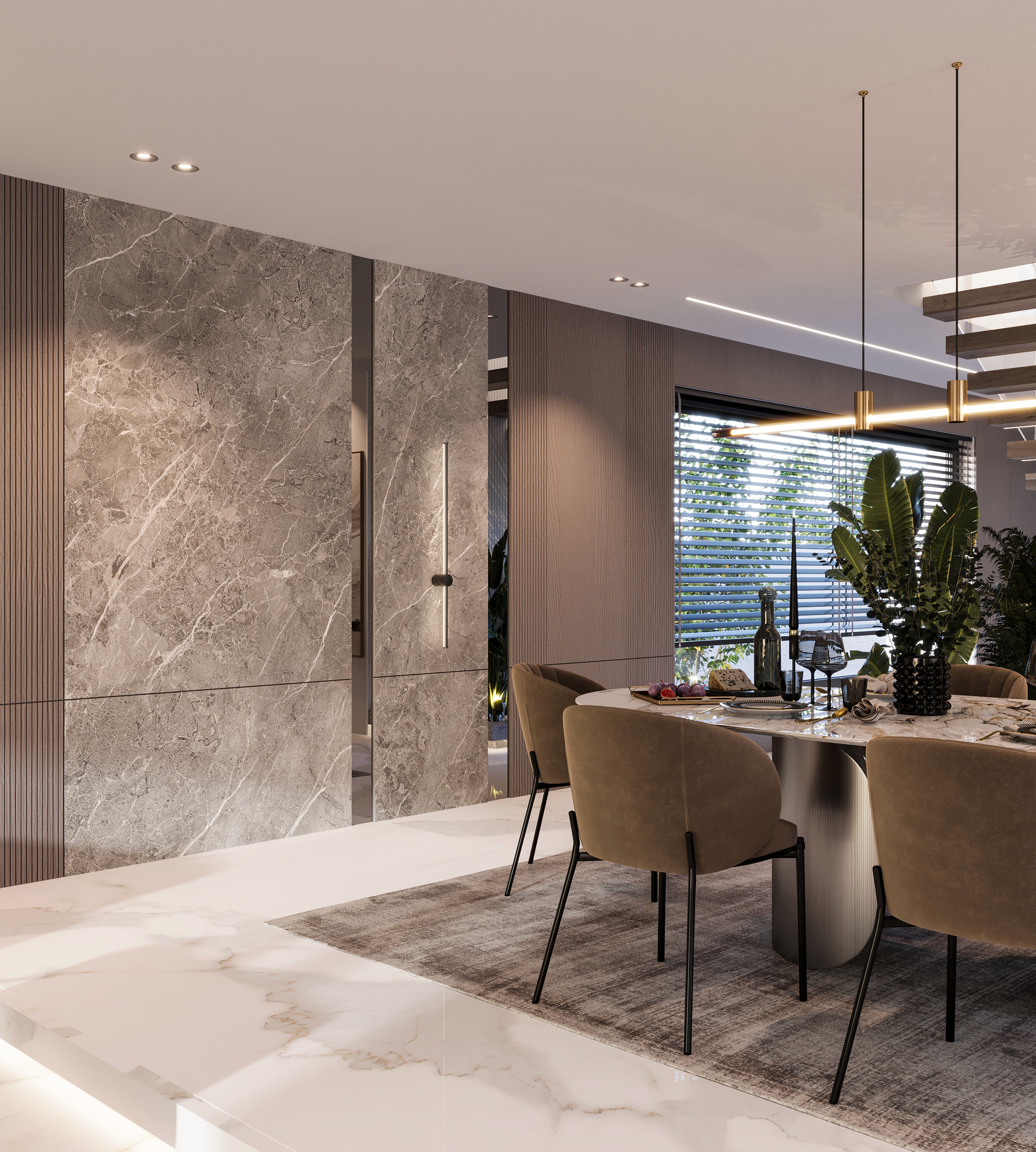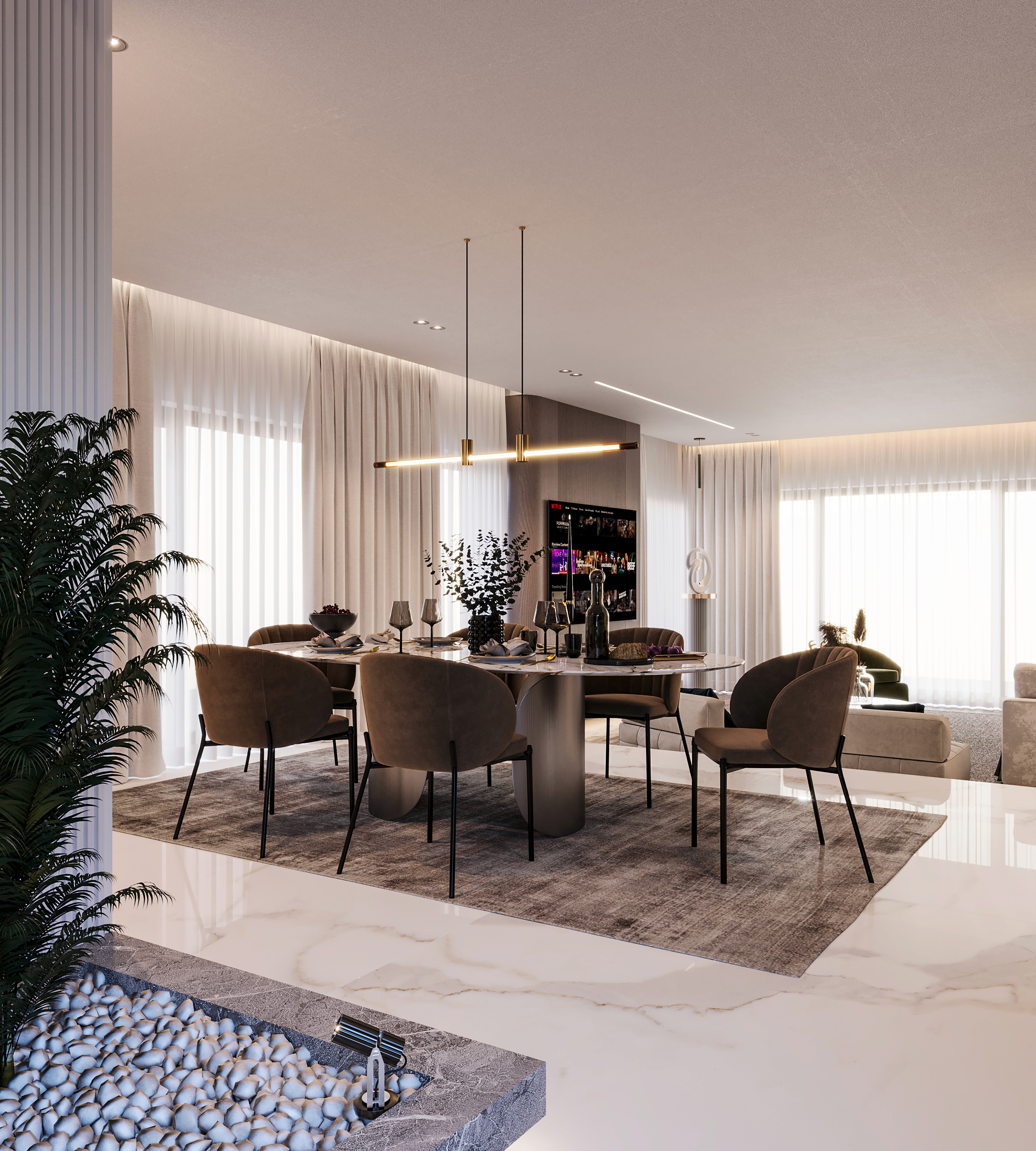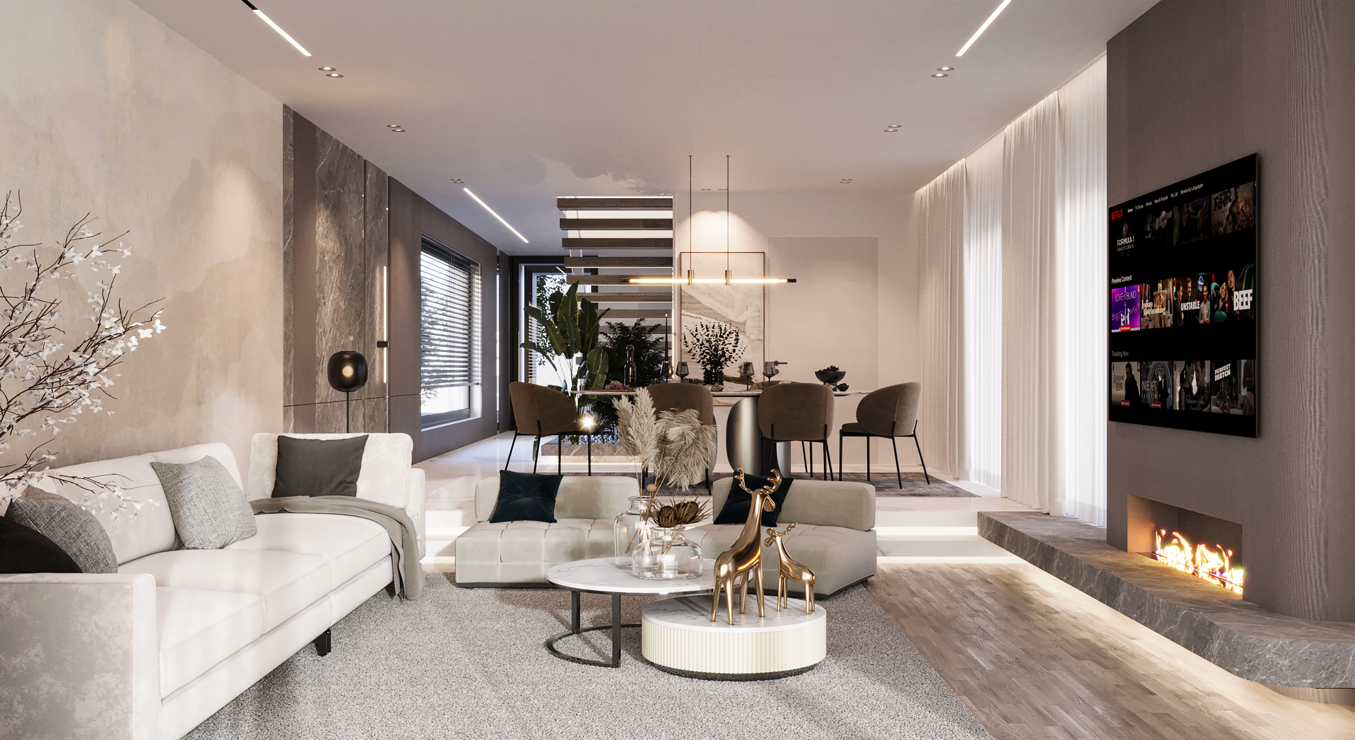 Designed as a seamless extension of modern living, the interior of this new residence reflects a refined balance between elegance, comfort, and contemporary expression. The living and dining spaces are conceived as open, fluid environments where light, proportion, and materiality define the atmosphere. A curated palette of noble materials, soft textures, and warm neutral tones creates a sense of understated luxury, while bespoke elements and carefully selected finishes add depth and individuality. Every detail is intentional—enhancing spatial clarity while inviting a calm, intimate experience. The result is an interior that feels sophisticated yet welcoming, where design elevates daily life and each space tells a quiet story of modern luxury.